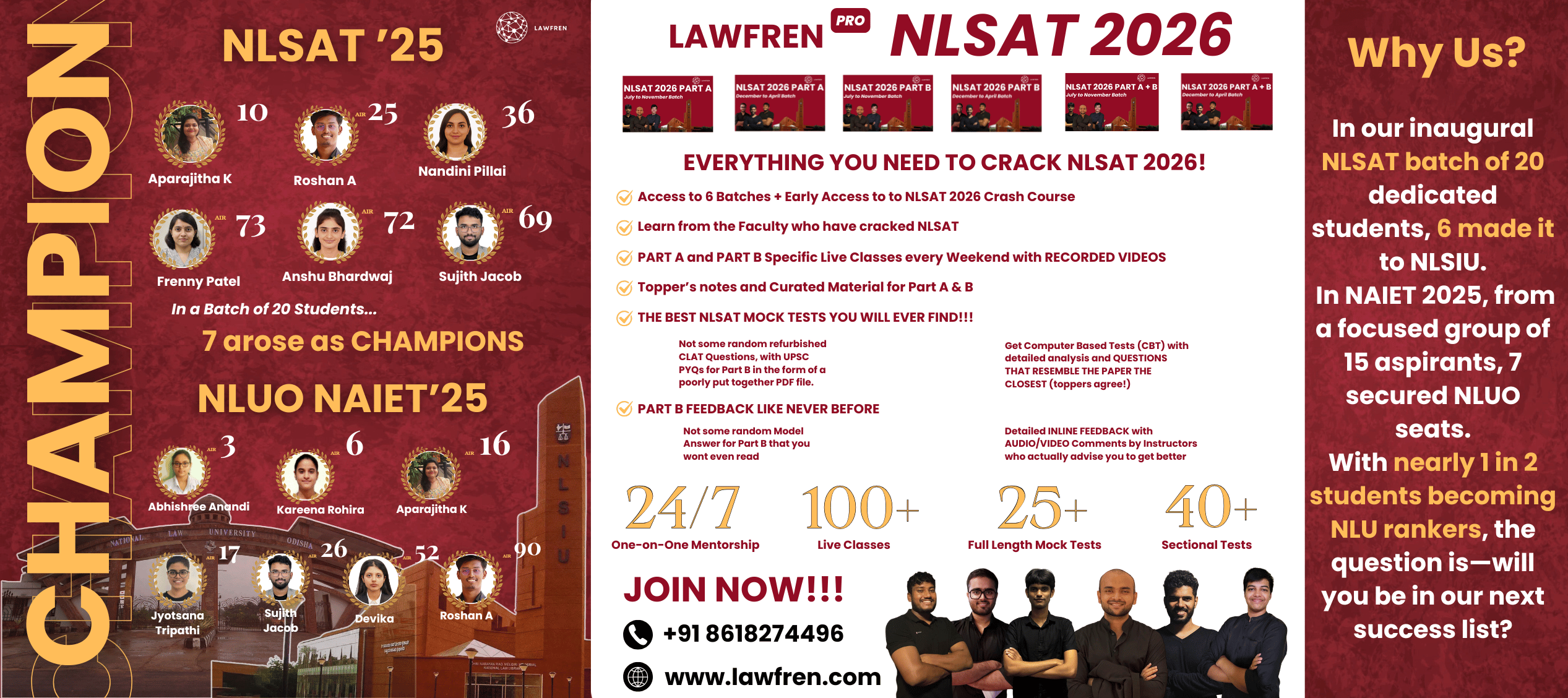 Choose from the best courses for your NLSAT, NLUO (NAIET), DSNLU (DET), CUET PG, MHCET and other law entrance exam preperation on www.lawfren.com